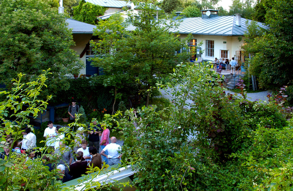 So beschrieb SZ online die verwunschene Welt, in die es mich anlässlich eines Kulturempfangs verschlug. Auf dem Weg dorthin fühlte ich mich wie auf einer Expedition, ziemlich orientierungslos querfeldein durch Münchens Vorstadt-Pampa, glücklicherweise gaben Papierschilder zumindest punktuell den Weg vor. Als ich jedoch das Ziel erreicht hatte, leuchtete mir der Grund für die Einladung auf gerade dieses Gelände ein: Ich befand mich unvermittelt in einer Traumlocation, auf einem 2000 qm großen Areal, welches mit einer Reihe hell beleuchteter, schmucker historischer Holzhäuser bestückt war und auf Anhieb verzauberte.