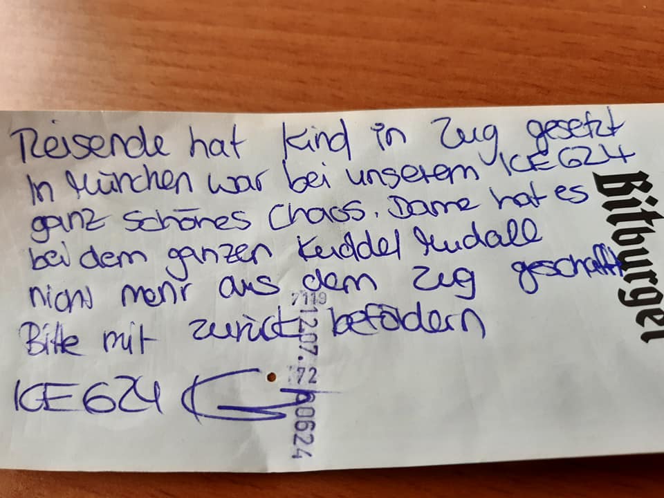 Wollte meinen unbegleiteten minderjährigen Enkel sicher im ICE unterbringen. Nachdem der – gefühlt – HALBE ZUG wegen eines Defekts kurzfristig ausgefallen war, herrschte nämlich das inzwischen gängige Chaos im Bezug auf Wagennummern und Reservierungen. Der Zug ist dann zwar verspätet, aber ganze 5 Minuten vor der angegebenen neuen Anfahrtszeit gestartet! Mit mir an Bord!! Ohne Ticket und EC Karte! Mit 35 € in der Tasche! Soweit die schlechte Nachricht. Die gute war, dass es ein ausgiebig langer Abschied von meinem Liebling wurde. Auch die Mitreisenden haben regen Anteil genommen und sich als Zeug*Innen bei der Fahrkartenkontrolle angeboten. War gar nicht nötig, denn die Schaffnerin stellte mir ganz unbürokratisch obigen Fahrschein-Zettel aus. Der wurde dann auch mit verständnisvollen Lächeln von allen Kontrolleurinnen als Fahrschein akzeptiert. Nur ein Schaffner startete einen Oberwichtig-Vortrag von wegen niemals in einen ICE steigen, mit dem man nicht fahren wolle. Aber der Ton blieb freundlich und das Bellen, bei dem es dann blieb, erschreckte nur meinen Enkel, der seine Oma schon irgendwo hinter den Stadtmauern Nürnbergs stranden sah. Armer lieber Enkel!