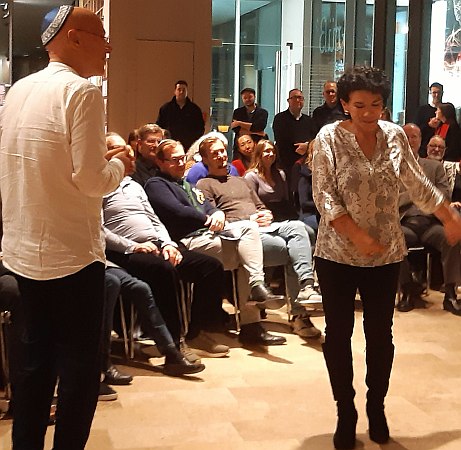 So schwang er dann auch temperamentvoll das Tanzbein zu traditionellen jüdischen Klängen des Ensemble Zikoron mit unserer Sinti-Freundin Ramona, die sich als ebenfalls Angehörige einer Minderheit solidarisch eingefunden hatte. Im Publikum ein Meer aus Kippas, Modell München“, designed von Terry persönlich. Eine ebenso einfache wie wirkungsvolle Schöpfung, die für diese Sichtbarkeit von Jüdinnen und Juden in unserer Stadtgesellschaft wirbt. Und/oder so tragen heute Abend Frauen wie Männer, Juden und Nichtjuden alle solidarisch diese Kopfbedeckung.