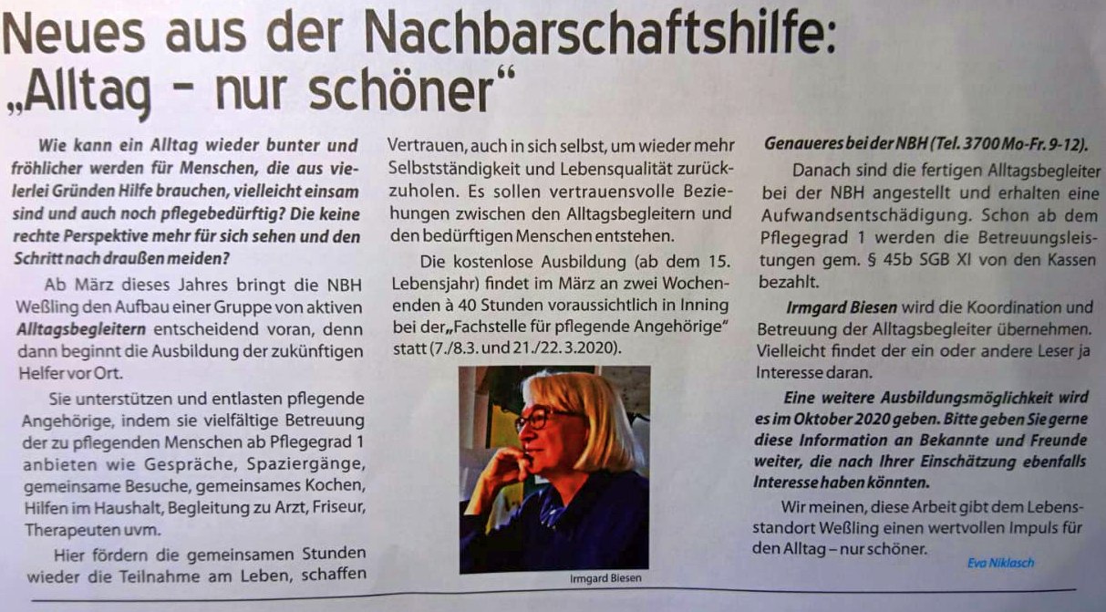 Das Leben führte die erklärte Naturliebhaberin nach Weßling, einem idyllischen Ort im Fünfseenland, nahe München. Sie wurde alleinerziehende Mutter zweier Kinder und baute zeitgleich, als Verwaltungschefin, ein mittelständiges Unternehmen mit auf, das sie in Folge über Jahrzehnte administrativ leitete. Kürzlich schlug ihr Leben wieder eine ganz neue Wende ein: Sie stieg aus der Firma aus und, nach einem Lehrgang, bei der Nachbarschaftshilfe Weßling (NBH) ein, mit dem Anspruch, nunmehr etwas ideell Sinnvolles zu leisten. Und da Irmgard Irmgard ist, dauerte es nicht lange, bis man ihr dort die Koordination übertrug, siehe nachstehenden Artikel.
