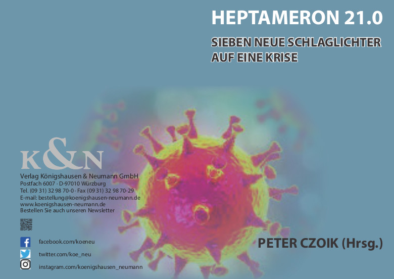 Im zweiten Jahr der Pandemie entschließen sich zwei Frauen und fünf Männer aus München und Umgebung erneut, ein Krisenbuch für Kulturinteressierte zu schreiben. In sieben Essays, die sich zahlenmäßig am Heptameron der Margarete von Navarra von 1559 orientieren, knüpfen sie an die aktuelle ›Corona-Krise‹ an und beleuchten damit zusammenhängende Erscheinungen. Wie jene dem Decamerone von Boccaccio nachgebildeten Erzählungen stellt das vorliegende Buch eine Nachahmung des Vorgängerbands Dekameron 21.0 dar und ermöglicht wieder verschiedene geisteswissenschaftliche Zugänge zum Corona-Thema.