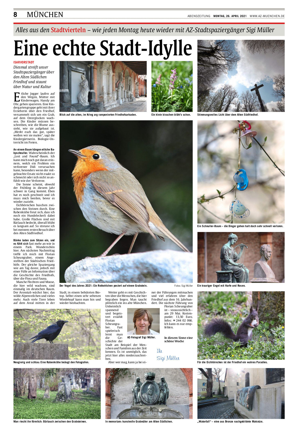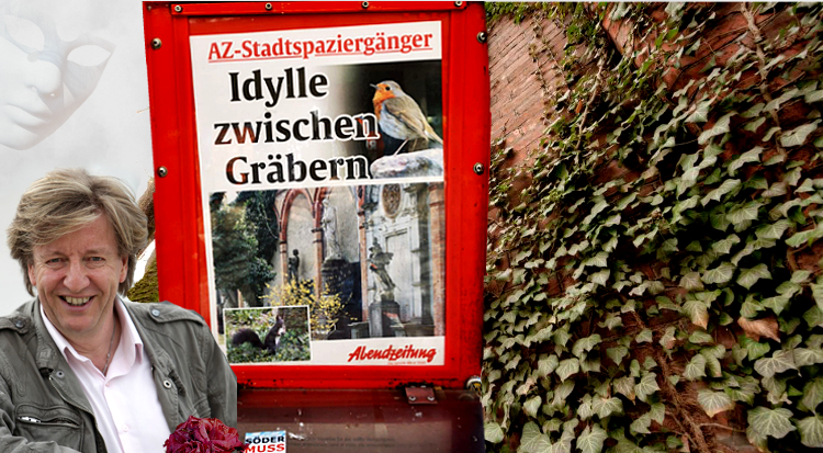 Nun bin ich gespannt, welche Eindrücke Stadtspaziergänger Sigi Müller von seinem Streifzug über den Alten Südlichen Friedhof für seine AZ-Reportage am Montag, 26.4.2021, uns LeserInnen mitgebracht hat. Obgleich ich den Ort seines Spaziergangs diesmal selbst schon so gut kenne … oder besser gesagt: „… gerade weil ich den Ort so gut kenne, freue ich mich darauf, ihn durch Sigi Müllers Augen in Bild und Text noch einmal anders zu erleben“.