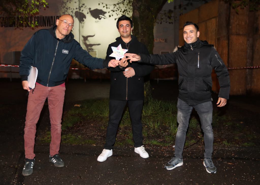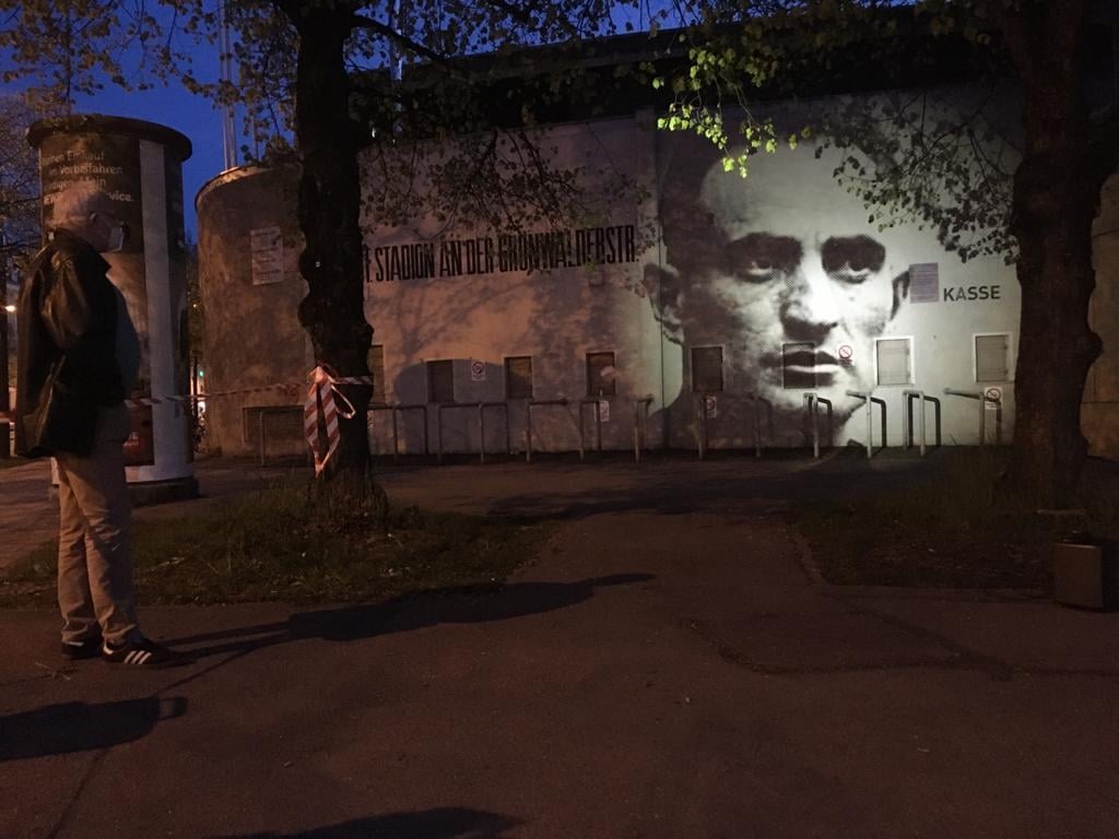 Vorerst bis 7. Mai (Verlängerung in Antragsphase), wird allabendlich, mit Einbruch der Dunkelheit, um ca. 20 Uhr, die Außenfassade des Grünwalder Stadions zum Gedenkort, mit Projektionen leider oft längst vergessener SportlerInnen, die von den Nazis verfolgt oder ermordet wurden und von denen nicht wenige ihre Wirkungsstätte in dieser Sportarena hatten.