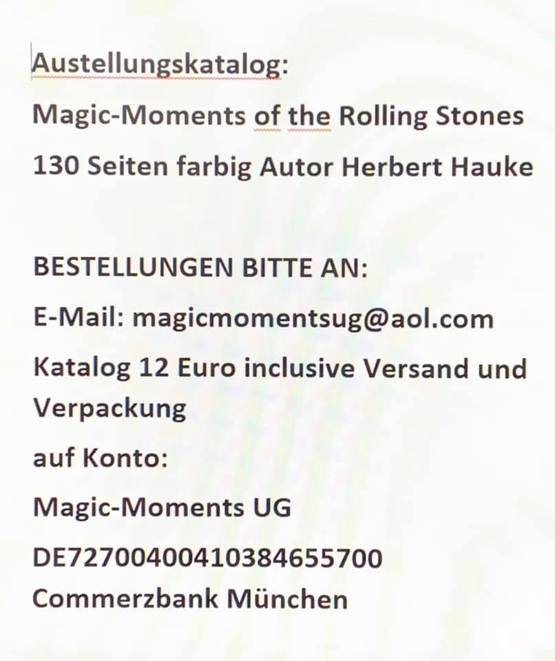 Dabei präsentiert Herbie Hauke die Exponate, ob in Ausstellung oder Katalog, aus einer so persönlichen und auch München bezogenen Perspektive, dass mir die legendären Stones plötzlich zum Greifen nahe erscheinen, als handle es sich um eine Ur-Schwabinger-Band, mit Gigs in meiner Stammkneipe und Ton-Aufnahmen beim Kumpel, im Studio um die Ecke. Wobei „Studio“ bereits ein Schlagwort ist, denn es waren in der Tat die legendären MUSICLAND STUDIOS, die 1974 und nochmals 1976 unserer Stadt die Ehre der Anwesenheit der Stones bescherten. „Ein Großteil des Albums ‚It’s only Rock n Roll‘ entstand daher in München. Besonderes Glück wurde dem Fotografen Didi Zill zuteil, der die Stones in dieser Zeit hautnah begleitete. Seine zahlreichen Aufnahmen aus jener Musicland-Studiozeit darf man durchaus als historisch bezeichnen …,“ heißt es dazu im Katalog, neben einem der vielen veröffentlichten Stones-Fotos von Didi Zill, von denen eines übrigens auch das Cover ziert.
