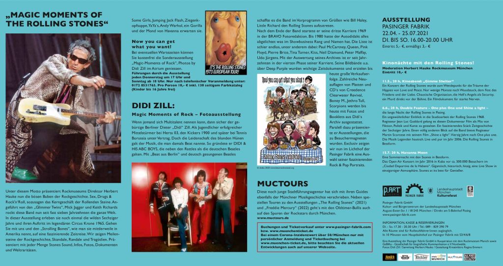 Die zeitweilig enge Verbindung der Stones zu München und zu der hiesigen Musikszene kam nicht nur bei der Zoom-Präsentation in der Pasinger Fabrik zur Sprache, sondern spiegelt sich auch im Katalog wieder, wie im Fall des – viel zu früh verstorbenen – Musikmanagers und Schlagzeugers Rudi Martini, der mir aus der der Jazz-Szene gut bekannt war. Da ich aber erst 1979 nach München – und zunächst in die Jazz-Szene – gekommen war, entnahm ich erst dem Katalog, wie eng auf Tuchfühlung mit den internationalen Musikstars Rudi sich tatsächlich betätigt hatte. Nachzulesen in der köstlichen Episode Ein Irrwisch hat Pause: „1973: – Die Stones kamen zu Aufnahmen nach München. Bereits mit dabei Ron Wood, den Rudi Martini angeblich als neuen Gitarristen empfohlen hatte, was aber nicht belegt ist. (…) Rudi traf während dieser Zeit oft einen extrem übermüdeten und gestressten Gitarristen, sprich den legendären Keith Richards. Ständig wuselte er um ihn herum. Hatte zu allem einen Kommentar und merkte nicht, wie er langsam in gefährliches Fahrwasser kam. Dabei hatte Keith ihn mehrfach gebeten, etwas runterzufahren (…)