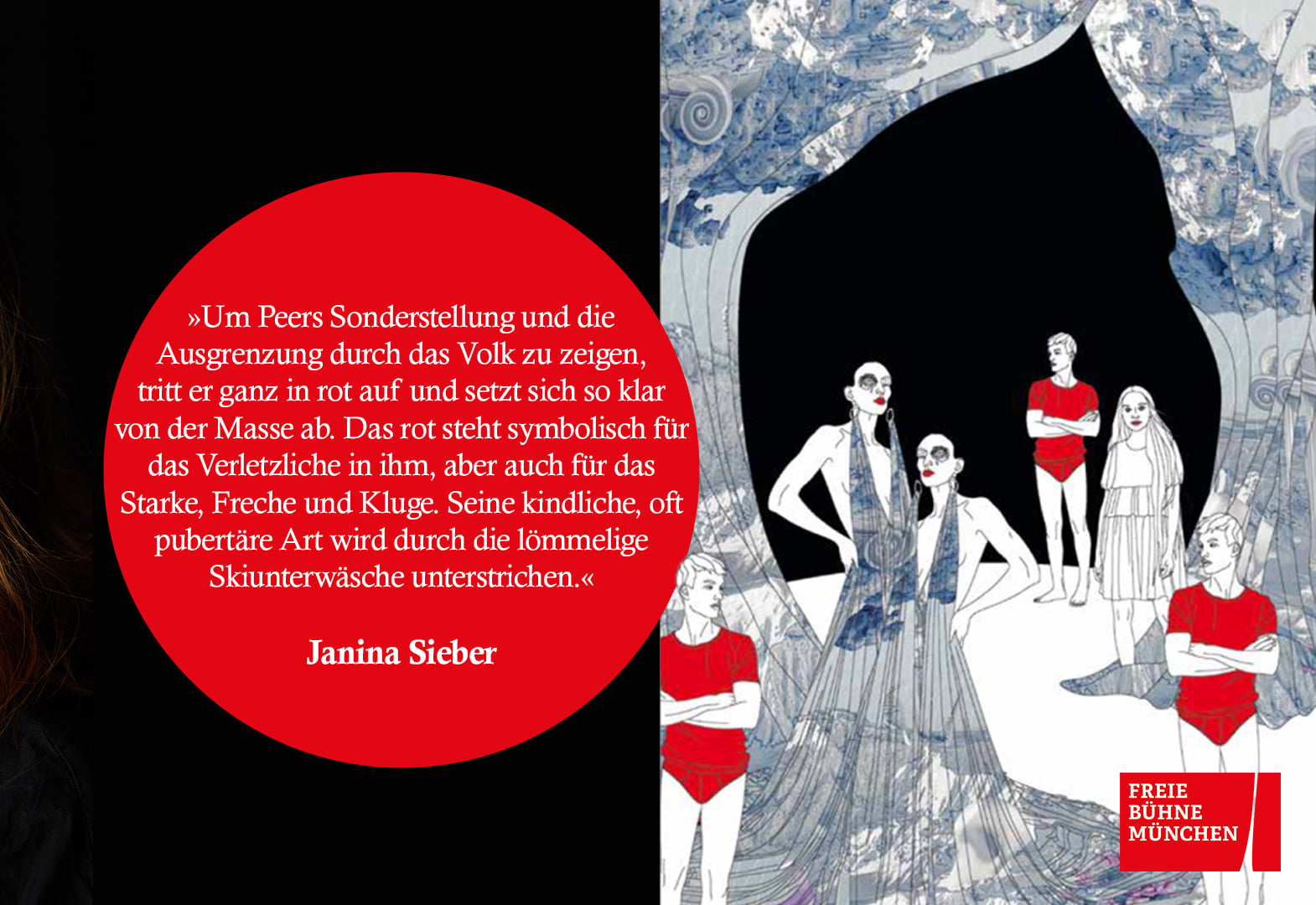 Einleuchtend in einem Theaterstück, das von der Suche eines jungen Mannes nach sich selbst erzählt. Dessen Zerrissenheit spiegelt sich in der sehr unterschiedlichen Typografie der PEER GYNT-DarstellerInnen wieder, sieben an der Zahl, Frauen und Männer, Große und Kleine, mit und ohne Behinderung. Auf Grund dieser Diversität innerhalb des Ensembles tritt die Vielschichtigkeit der Titelfigur besonders deutlich zutage. Dennoch bleibt stets die Übersicht gewahrt, denn ein knappes rotes Outfit markiert, welche der DarstellerInnen gerade PEER GYNT verkörpern, während andere in die weiteren Rollen des Stückes schlüpfen, angesiedelt zwischen Realität und Phantasie.