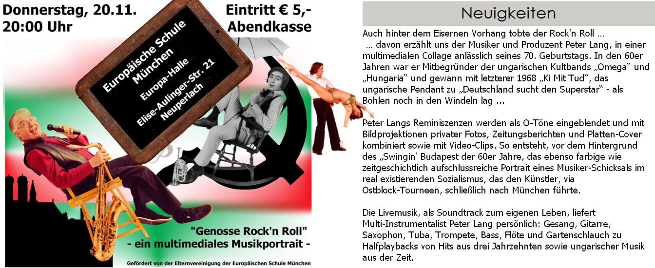 Bei diesem Gig an der Europäischen Schule erfuhr ich auch von einer ungarischen Schülerin, wie bekannt damals Peter Lang tatsächlich in Budapest war. Sie sei extra wegen Peter Lang zur Aufführung gekommen; ihre Großmutter sei bis heute ein großer Fan …