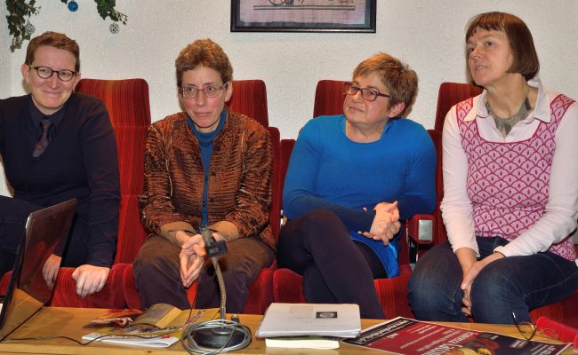 Auf pittoresken Kinosesseln: Die Damen von musica femina München, vom Archiv Frau und Musik und von Musikerlebnis/Tonicale, v.li: Susanne Wosnitzka, Mary Ellen Kitchens, Dr. Ulrike Keil, Anne Holler-Kuthe