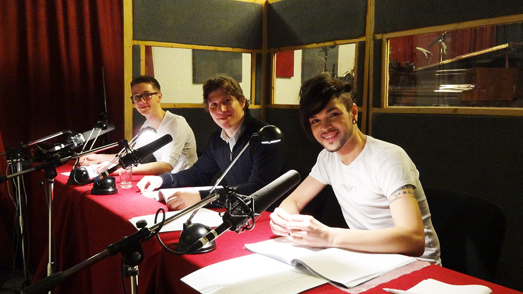 sowie, ganz rechts: Sprachaufnahme Mio mein Mio für das Münchner Theater für Kinder: Jochen Streicher, Andreas Meyer und Til Schulz