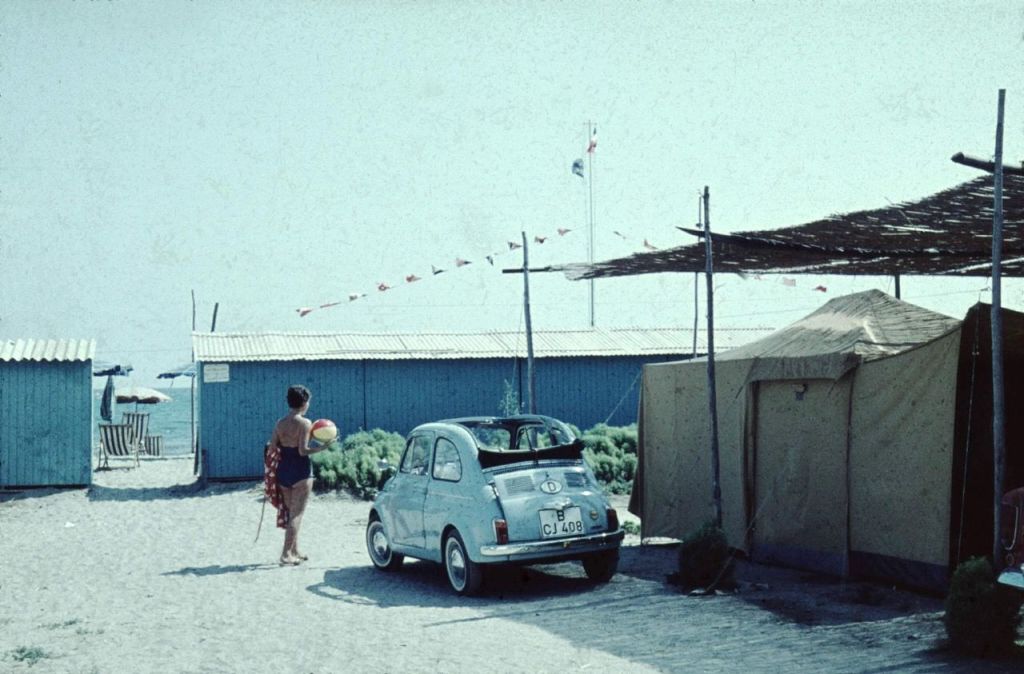 Der eigentliche Protagonist dieser Reminiszenz, der kleine FIAT auf dem Foto, schaffte es tatsächlich noch weiter bis an die Adria! Im Hintergrund die damals typischen, sehr schlicht gehaltenen Umkleidekabinen zu erkennen. Deren hölzerner, mit Sonnenöl durchtränkter Geruch steht für mich bis heute für unbeschwerte Standurlaube. Damals erwischten wir wohl die Haupturlaubszeit für unseren Trip ans Meer, denn in der Zeit um Ferragosto (um den 15. August herum) drägte – und drängt sich noch immer – ganz Italien an den Stränden. Wer es sich leisten konnte, unterhielt damals eine Zweitresidenz, egal wie klein, direkt am Meer. Frau und Kinder verbrachten dort en bloc die dreimonatigen Schulferien, die bis zum 1. Oktober andauerten. Die Väter gesellten sich an den Wochenenden und vor allem Mitte August dazu.