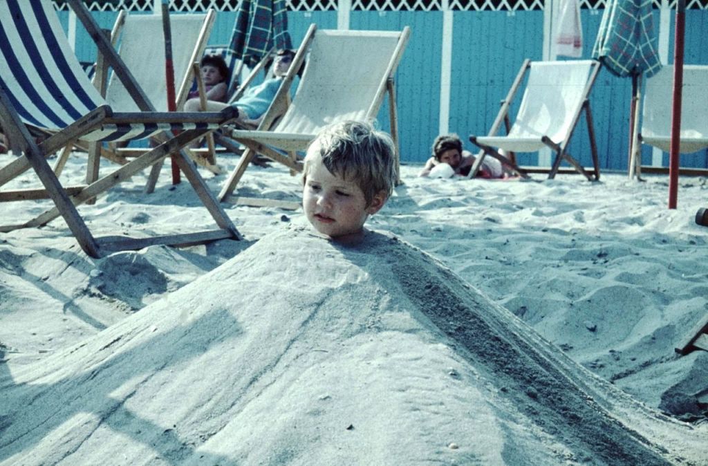 Schon damals hielt ich offensichtlich lieber den Kopf hin – und in die Kamera – als ihn in den Sand zu stecken 😉 Wer mich damals einbuddelte, weiß ich nicht, aber ganz offensichtlich machte ich mir so meine Gedanken, wie ich diese ungewohnte Lage eigentlich finden sollte.