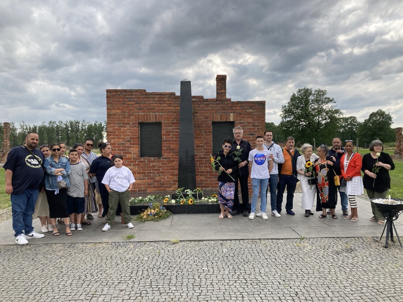 Rechts: Eine von Madhouse 2023 organisierte Reisegruppe vor dem Mahnmal der Sinti und Roma in der KZ-Gedenkstätte in Auschwitz-Birkenau; die Reise führte zudem nach Krakau, u.a. „Schindler-Museum“ und Ghetto