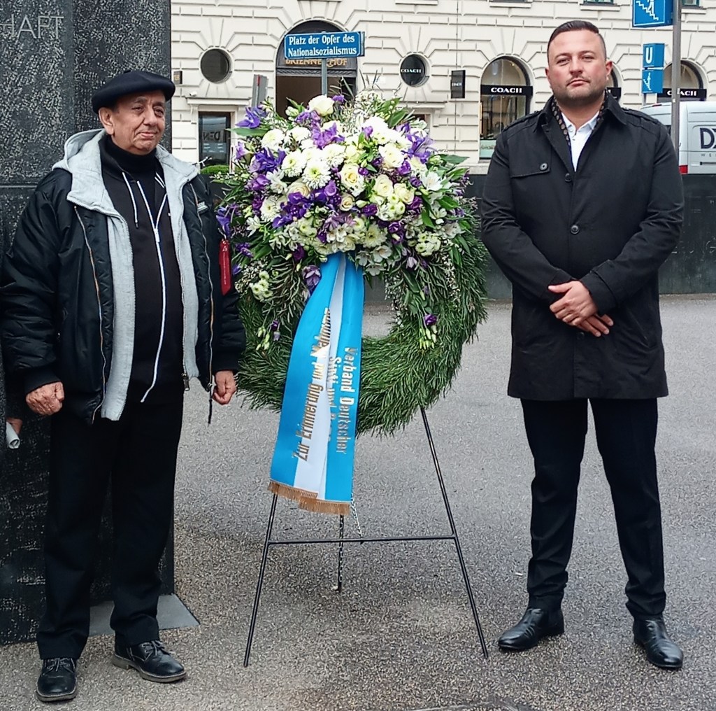 - Erich Schneeberger, langjähriger Erster Vorsitzender im Landesverband Deutscher Sinti und Roma Bayern e.V. und Hugo Höllenreiner bei der Kranzniederlegung am Ewigen Feuer, Platz der Opfer des Nationalsozialismus