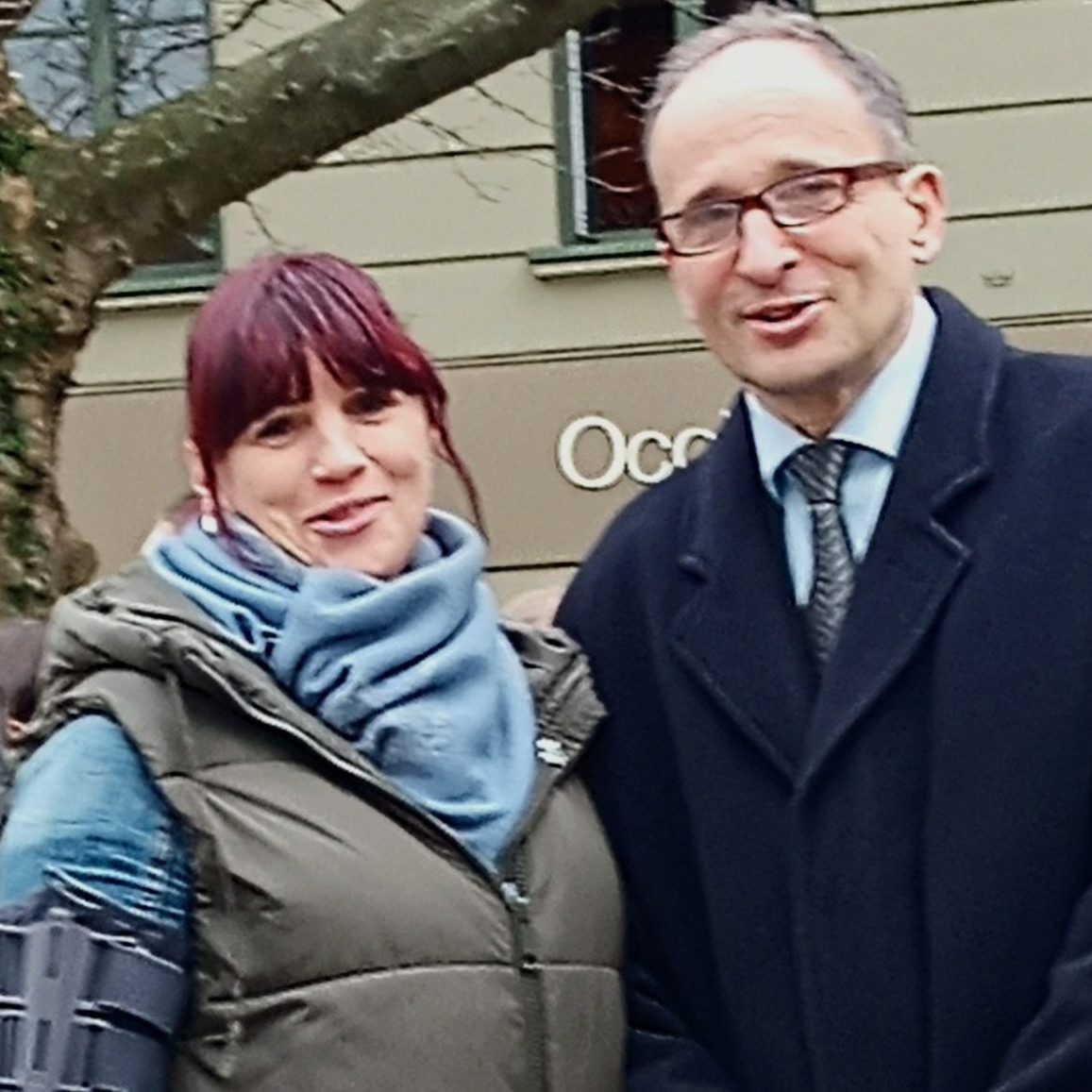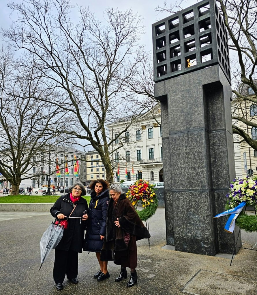 Daher breitete sich ehrliche Wiedersehensfreude aus, als Alexander Diepold und ich am Platz der Opfer des Nationalsozialismus auf unsere KooperationspartnerInnen von 2023 trafen, Kriminalkommissar Harald Frießner (u.) und Kriminalhauptmeisterin Bianca Küper, links im Bild mit Alexander Diepold und seiner Schwester Roswitha Stein.
