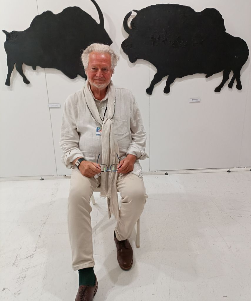 Die dunkle und spannend unregelmäßige Oberfläche seiner aus Holz gefertigten Stiere erzielt er durch ein spezielles Verbrennungsverfahren.