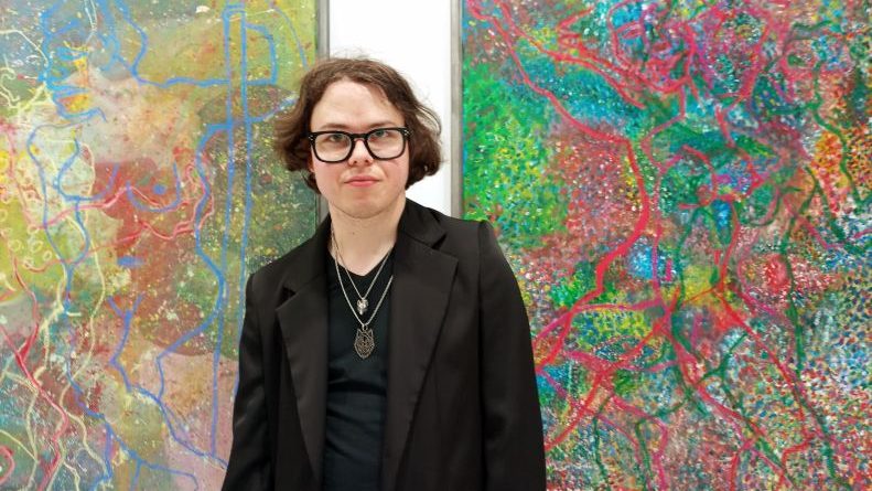Einer dieser „jungen, aufstrebenden Künstler“ ist Maximilian Zander, der parallel zu einer Kunstausbildung jüngst seine erste Schritte in die Welt der Kunstausstellungen gestetzt hat, in den Fußstapfen seiner Mutter Andrea Wildner, einer bekannten Schauspielerin und Malerin. Bei der Messe war er mit zwei Bildern vertreten, von denen das Gemälde unten rechts zugleich sein neuestes Werk ist, wie er mir am Stand erläuterte.