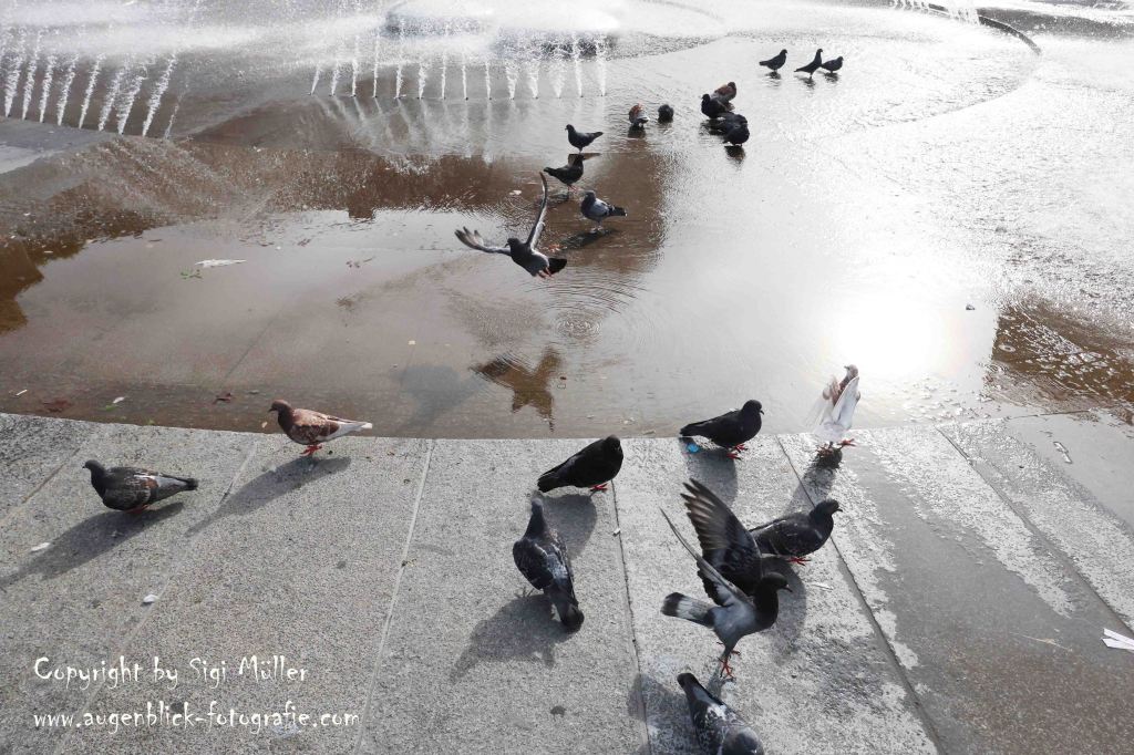 Was mich sehr verwundert hat: An der Münchner Freiheit, am Odeonsplatz usw. werden täglich größere Mengen Korn und Mais verfüttert, soviel, dass die Tauben fast gelangweilt davon essen. Von wem weiß ich nicht. Keine gute Idee!