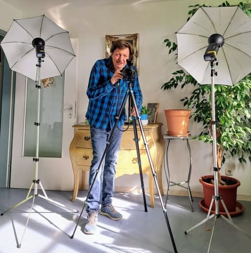 Foto links: Sigi Müller funktioniert bereits am Vortag meine Wohnküche zum Fotostudio um –