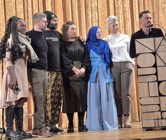 3.11.2025, Erkan Inan, Vorsitzender von ausarten – Perspektivwechsel durch Kunst, dem prämierten Festival-Team, hält die Dankesrede; Foto: Thomas Niederbühl