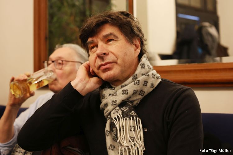 • Mit dem Gesicht der Kamera zugewandt ist der Verleger Franz Westner, SALON LiteraturVERLAG, Veranstalter der Literaturreihe „litbox und punktuell von Kulturgroßprojekten, z.B. das Kulturprogramm zur Langen Einkaufsnacht in München