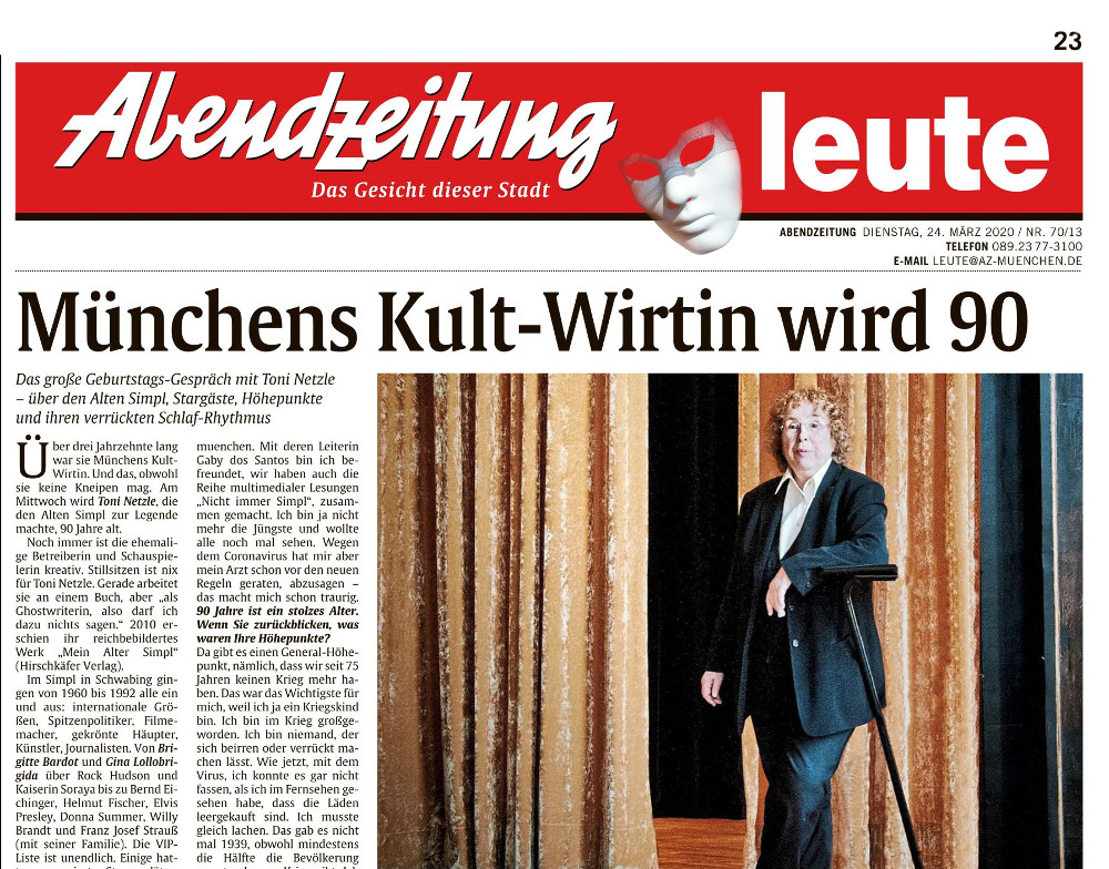 Toni Netzle, gelernte Schauspielerin und Prominentenwirtin von 1960 – 1990 im historischen Alten Simpl , gilt heute schon als Münchner Legende. Ihre Reminiszenzen bilden 30 Jahrzehnte Bonner Republik aus der Tresenperspektive ab. Auf Grundlage ihrer Memoiren „Mein Alter Simpl“ (2010/Hirschkäfer Verlag, obere Bilderserie, Abb. u.r.) produzierte Gaby dos Santos zwischen 2012 und 2020 eine Reihe von Lesungen kombiniert mit Multimedia-Einspielungen, in denen auch zahlreiche prominente Weggefährten zu Wort kommen.