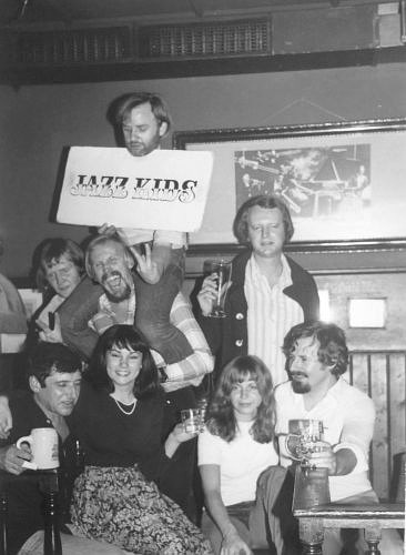 in der Mitte der schottische Trompeter George Burt (RIP), rechts der englische Saxofonist Pete Robinson (RIP), dahinter an Drums Dieter Grönke (RIP)