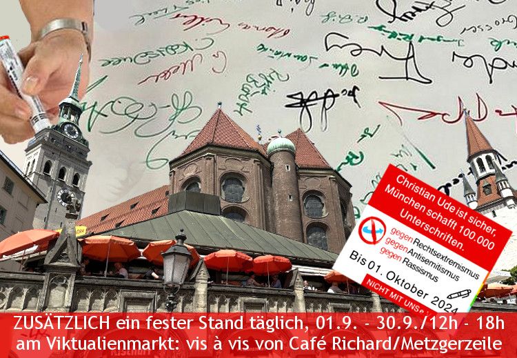Hintergründe, Fotos und Videos zur überparteilichen Unterschriftenaktion von „Nicht mit uns“ gegen Rechtsextremismus, Antiziganismus, Antisemitismus, Rassismus sowie Diskriminierung in jeglicher Form! „(…) Ron Williams setzt eine kühne Wette: Er fordert den ehemaligen Oberbürgermeister Christian Ude heraus, bis zum 1. Oktober 100.000 Unterschriften gegen Rechtsextremismus, Antisemitismus und Rassismus in München zu sammeln (…)“ > MEHR…