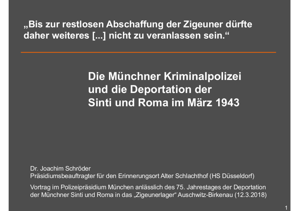 In Bezug auf den Holocaust der Sinti & Roma spielte die bayerische Polizei eine Vorreiterrolle: Die Grundlage zur Erfassung und späteren Deportation deutscher Sinti & Roma lieferte schon früh der königlich bayerische Polizeipräsident Alfred Dillmann (1849 – 1924) mit seinem fatalen, sog. Zigeunerbuch und von 1899 bis zur Verlegung 1938 nach Berlin war die „Zigeunerzentrale“ im Polizeipräsidium in der Ettstraße angesiedelt.